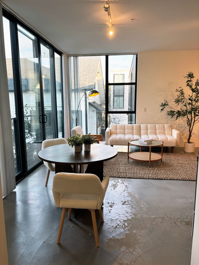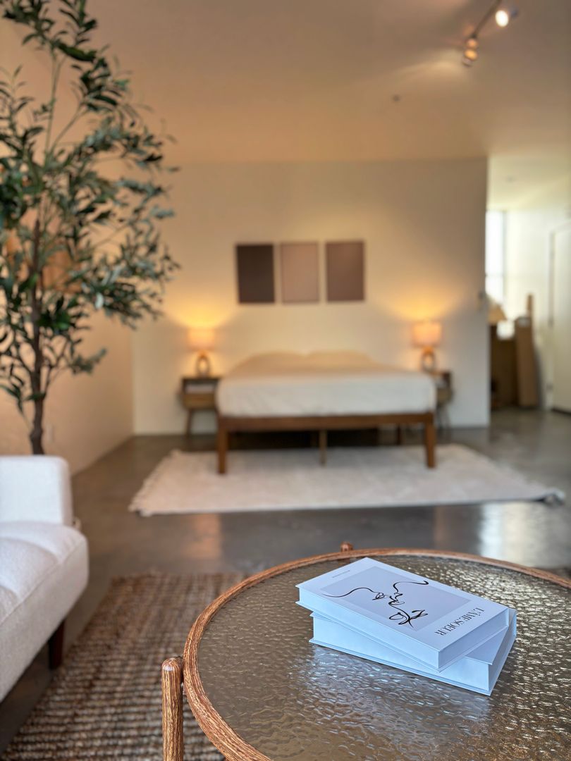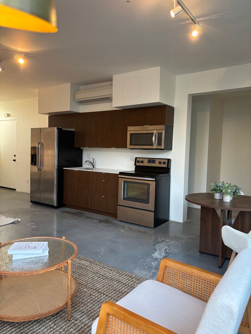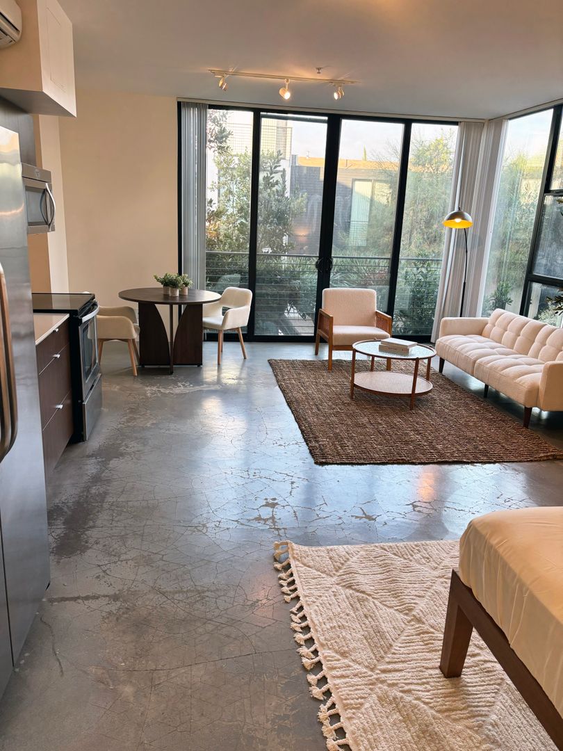 This airy and spacious studio features polished concrete floors, modern hardwood cabinetry, stainless steel appliances, and floor-to-ceiling windows that fill the space with natural light.