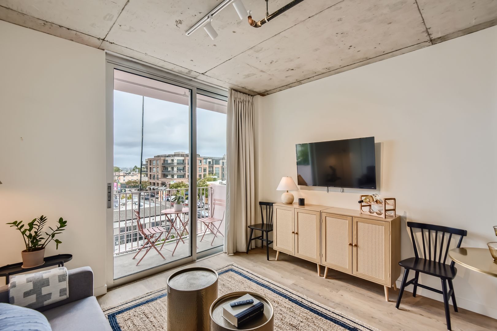 - Wall of windows with private balcony, featuring city and mountain views