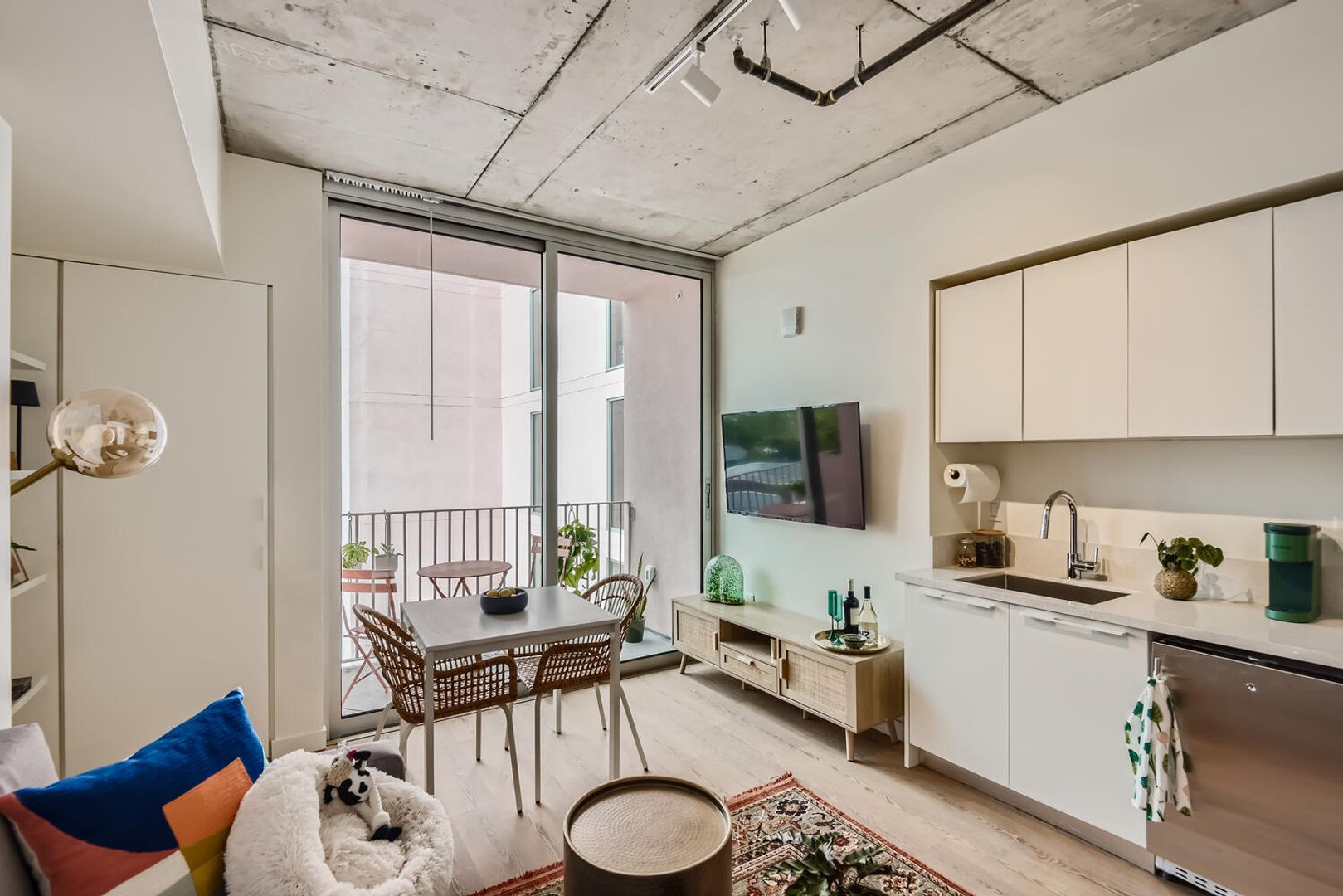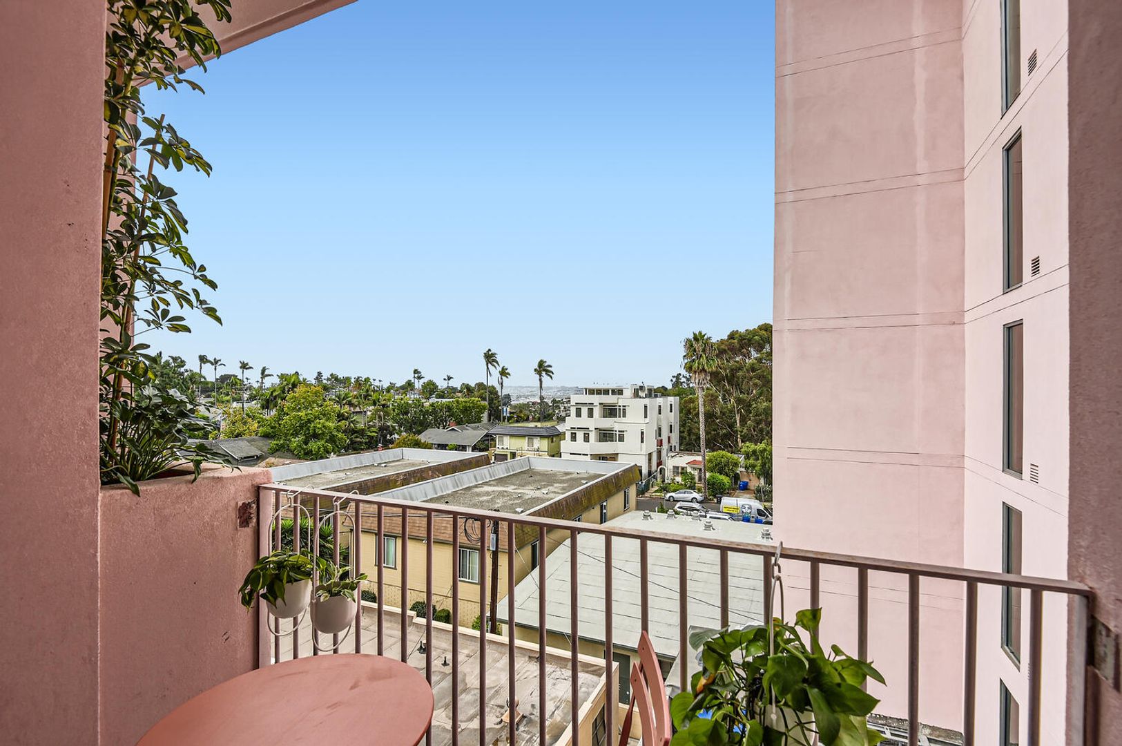 - Wall of windows with private balcony, featuring city and mountain views